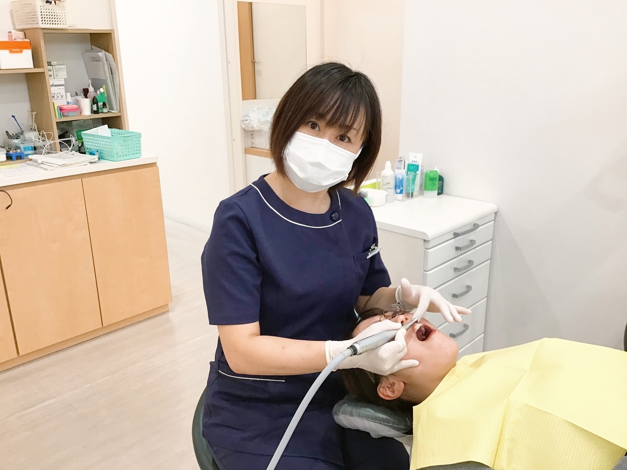 主に治療のサポートをしていただきます。バキュームという機械でお口に溜まったお水を吸ってもらったり、セメントという接着剤を練ってもらったり、器具の受け渡しをします。