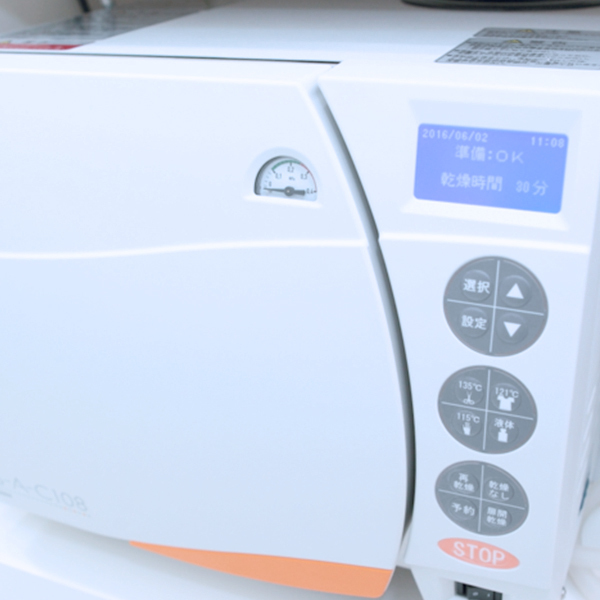 また、患者さまごとに治療器具の消毒・滅菌を徹底しています。もちろん、紙コップやエプロンもディスポーザブル(患者さまごとに使い捨て)にしています。